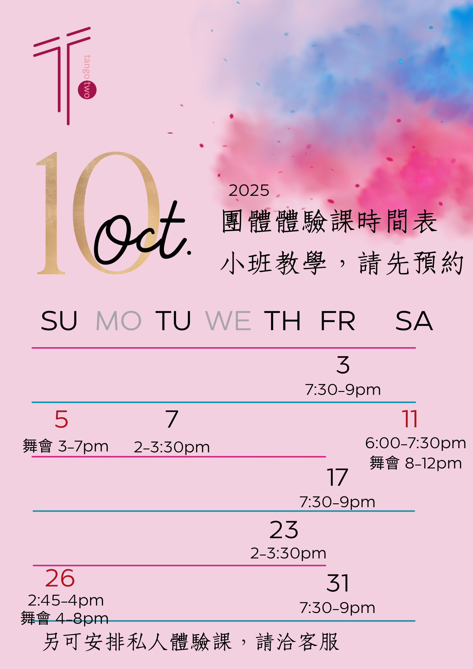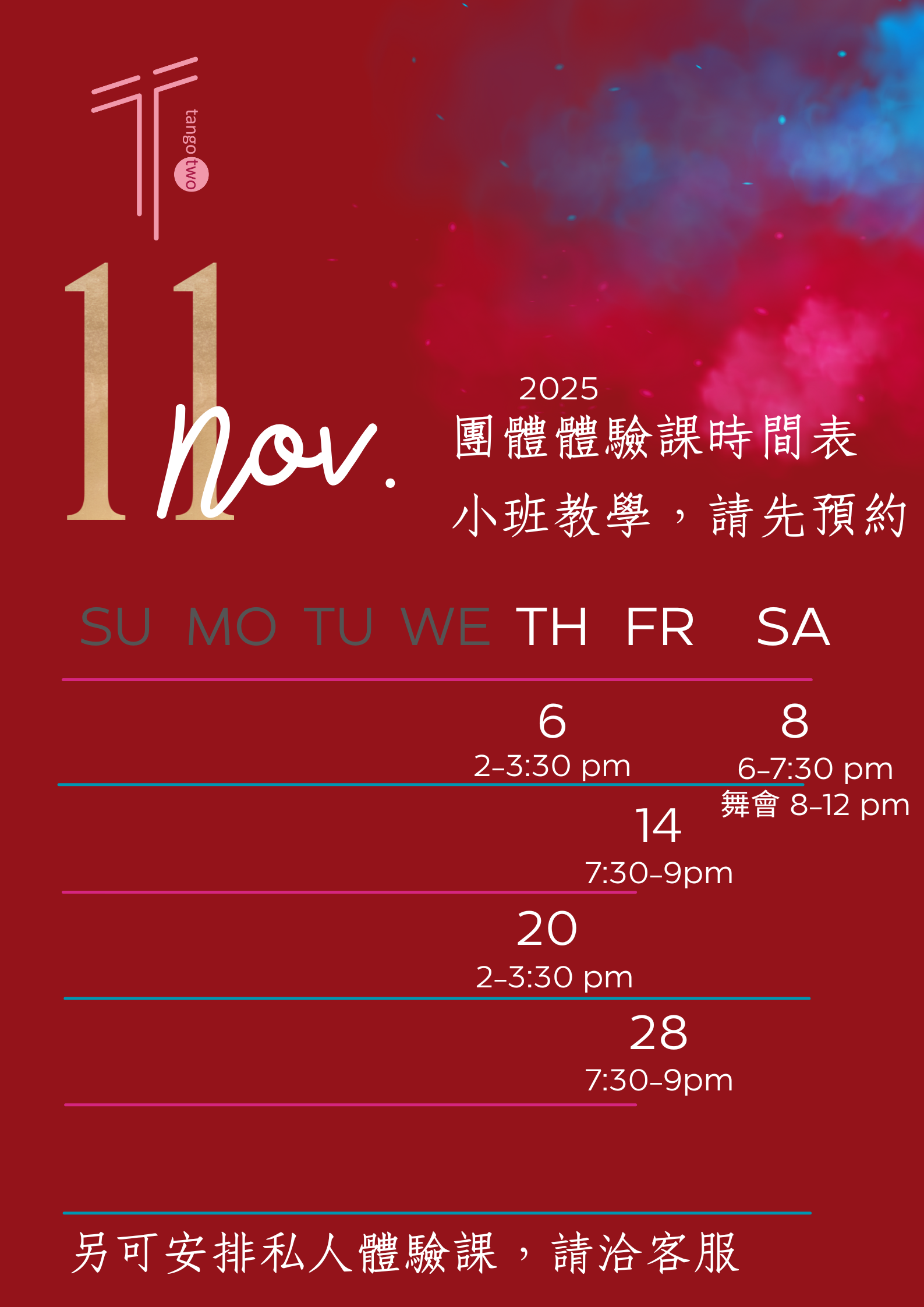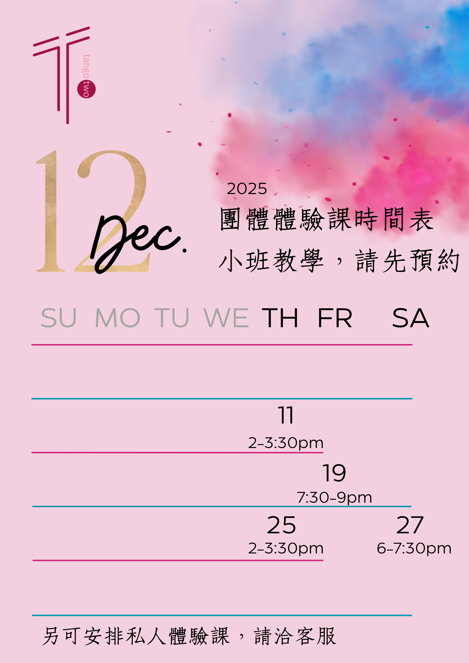 1. 實體上課全程採用開式舞姿(open embrace),只有手臂接觸,上半身不接觸。閉式舞姿(close embrace)課程會另外標注。