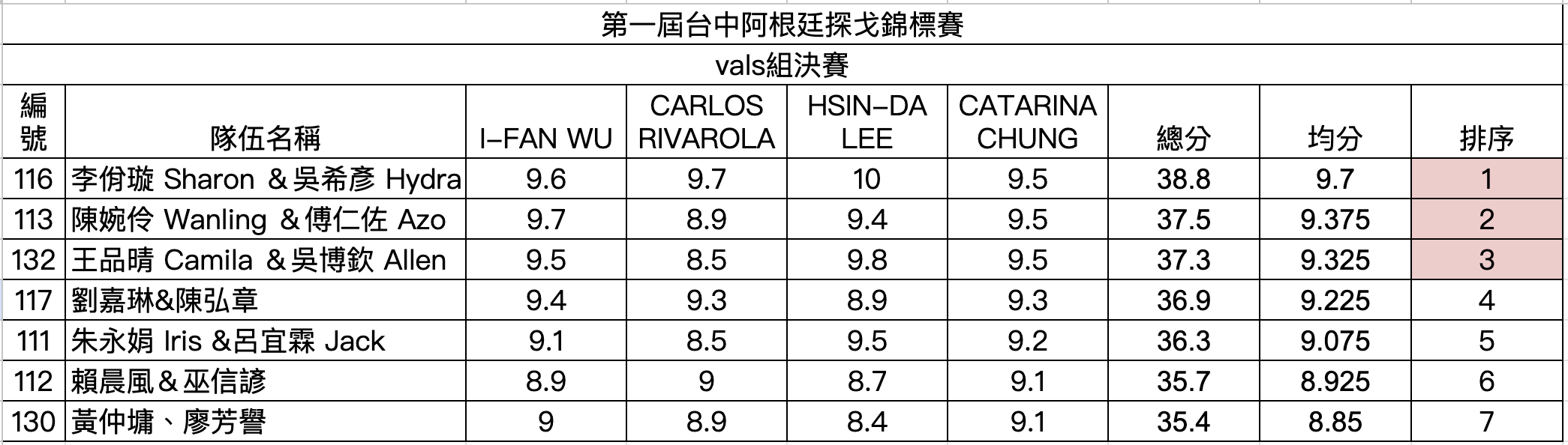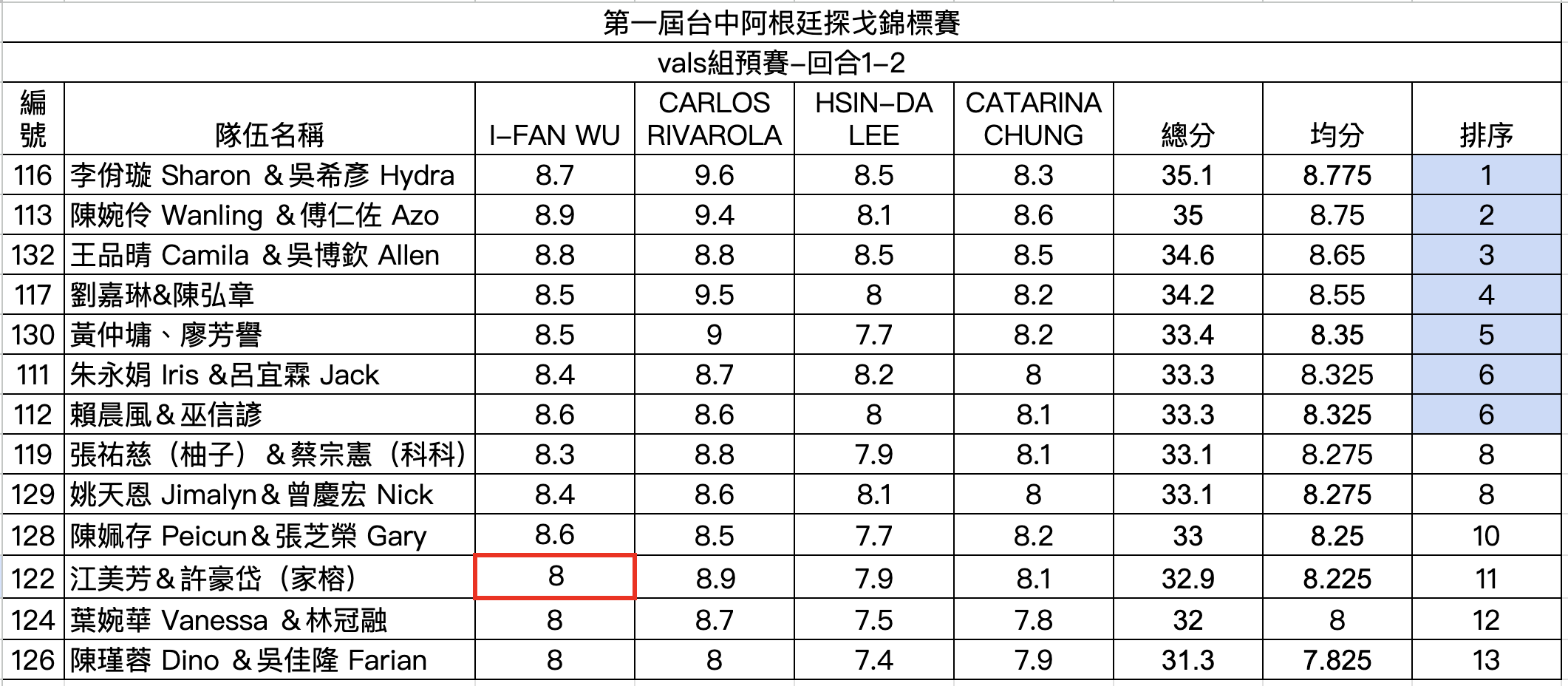 *一、 由於評審長與主辦單位事前決議「決賽名單無需受評審們再次確認」,因此當評審吳依凡在填寫vals組預賽成績,不慎將編號122組江美芳、許豪岱成績8.6寫成8.0,導致此隊參賽者無法晉級決賽時,未能及時發現。等到決賽完成後發現成績填寫錯誤時,已造成無法挽回的遺憾局面,並對此隊參賽者後續參賽心情造成相當程度的影響。如果沒有發生這樣的失誤,決賽前六名局面可能會有所不同。主辦單位對此感到萬分抱歉。